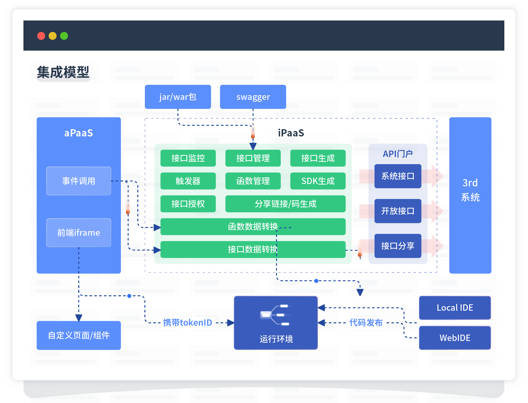 集成模型包括平台本身前、、、、后端能力的扩展,,,,也支持通过API门户和第三方系统进行交互。。