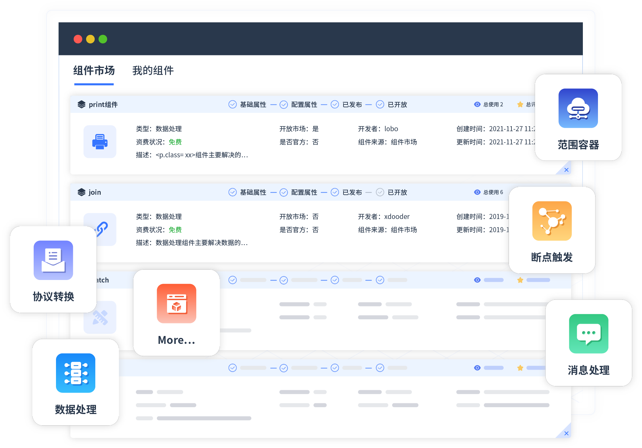 针对集成场景,,,,圆梦钱包提供组件市场,,例如协议转换、、、消息处理、、、文件操作等。。除平台提供的组件外,,,,客户可以自定义所需组件。。。
