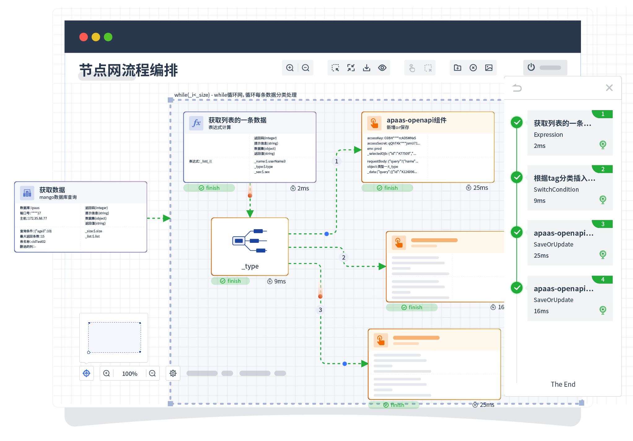 针对集成场景,,组件定义后支持进行流程编制,,,不同于传统代码方式,,,,通过图形化展示,,,,支持在线调试、、日志查看和运行回放。。。。